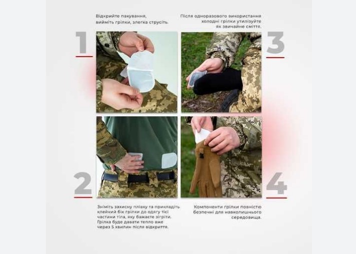 - Розташовуйте правильно. Грілки для рук і ніг військових слід вкладати безпосередньо у рукавички або взуття, не допускаючи відкритого контакту з вологою.